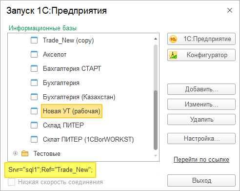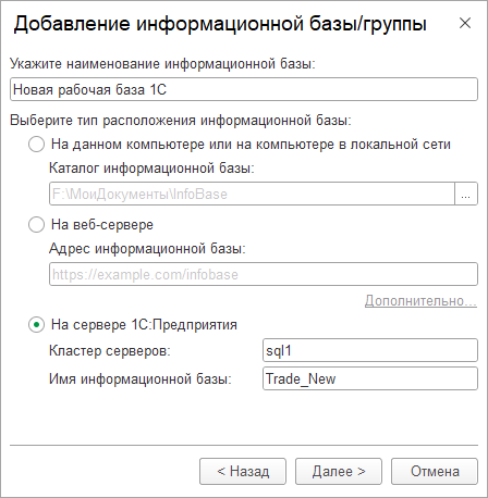 Кластер серверов: sql1, имя информационной базы: Trade_New