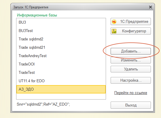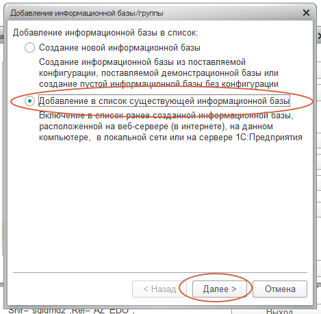 В окне настроек выбираем «Добавить существующую базу» и нажимаем «Далее»