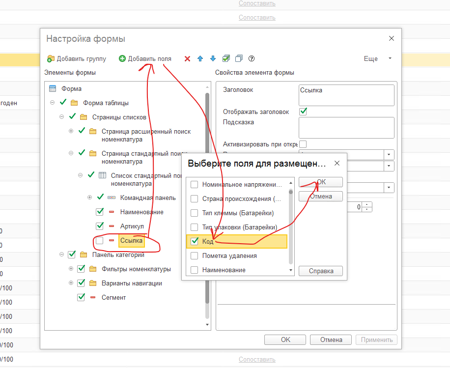 Найти в открывшемся окне строку «Ссылка». Нажать «Добавить поля». Поставить флажок напротив нужного поля. Нажать «Ок». Потом «Применить».