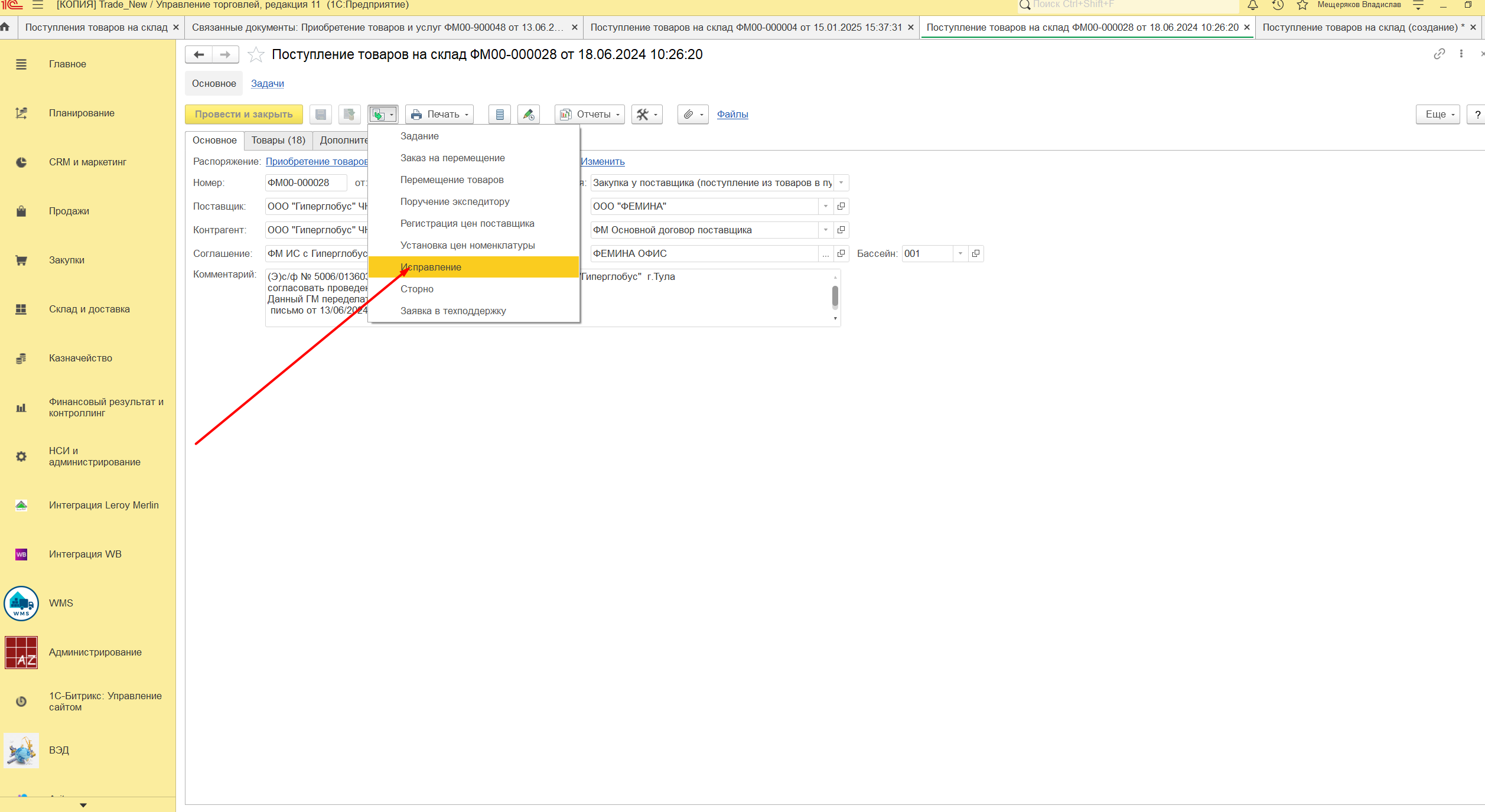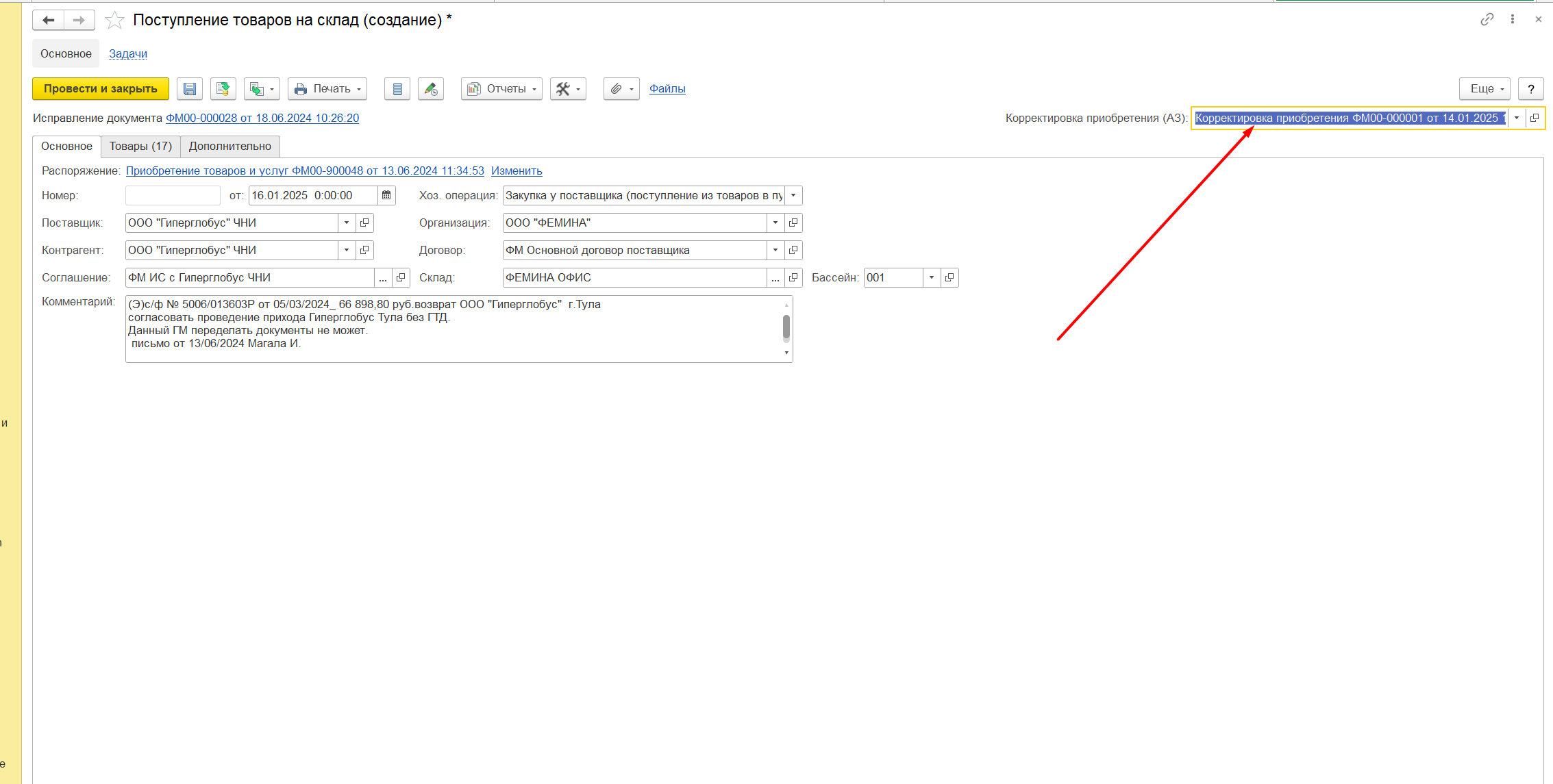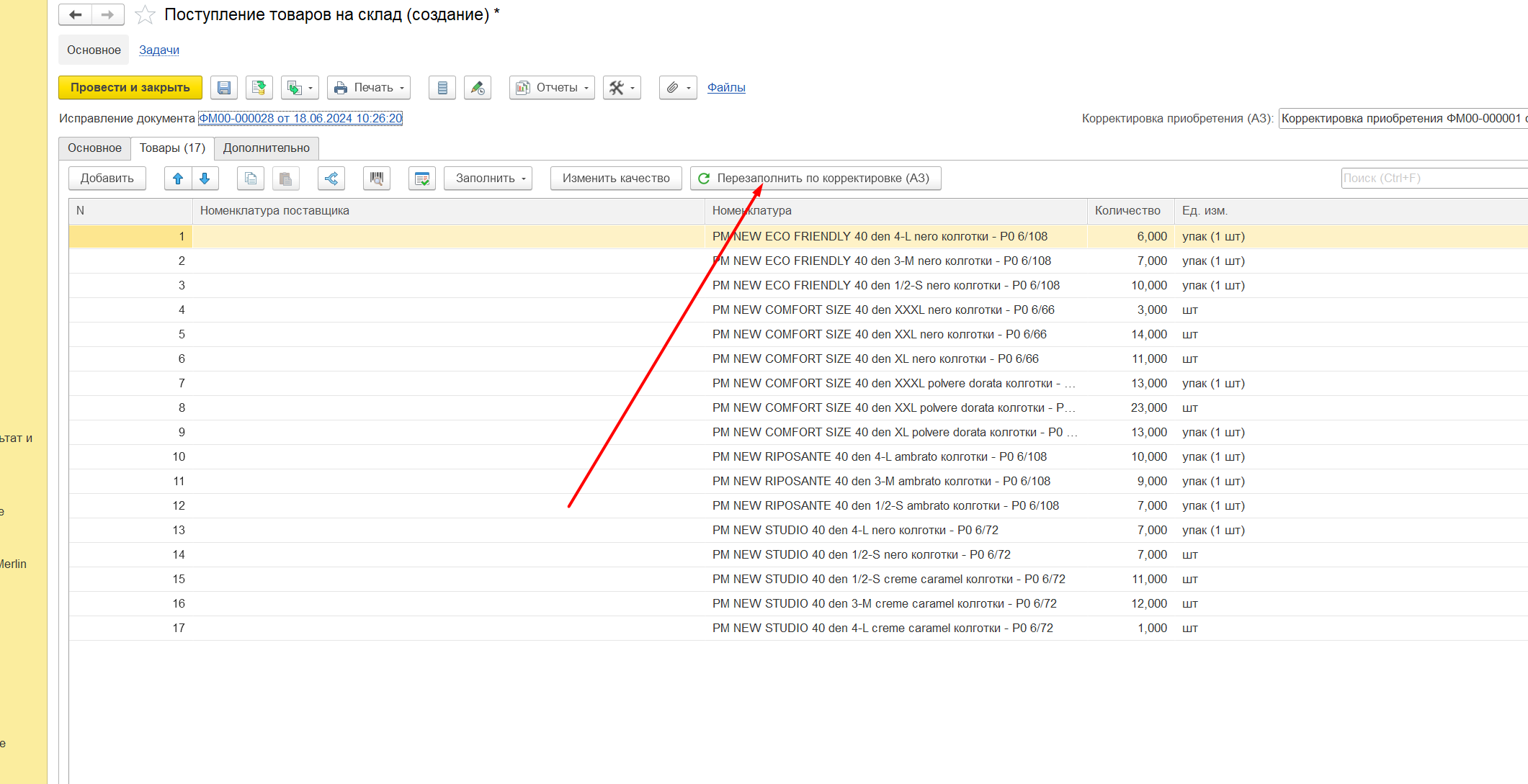 При необходимости исправить остатки по корректировке приобретения (в пути), используется «Исправление» в документе «Поступление товаров на склад» Рисунок 1 Создается идентичный документ, текущего периода, который можно редактировать. В этом документе можно поправить поступление либо вручную, в табличной части «Товары», либо выбрав нужную корректировку, Рисунок 2 Нажать кнопку «Перезаполнить», в табличной части «Товары». Рисунок 3 Тогда количество товара заполнится по выбранному приобретению. Далее нужно провести документ. Дату можно использовать только текущего периода. В остальных случаях поменять не даст.