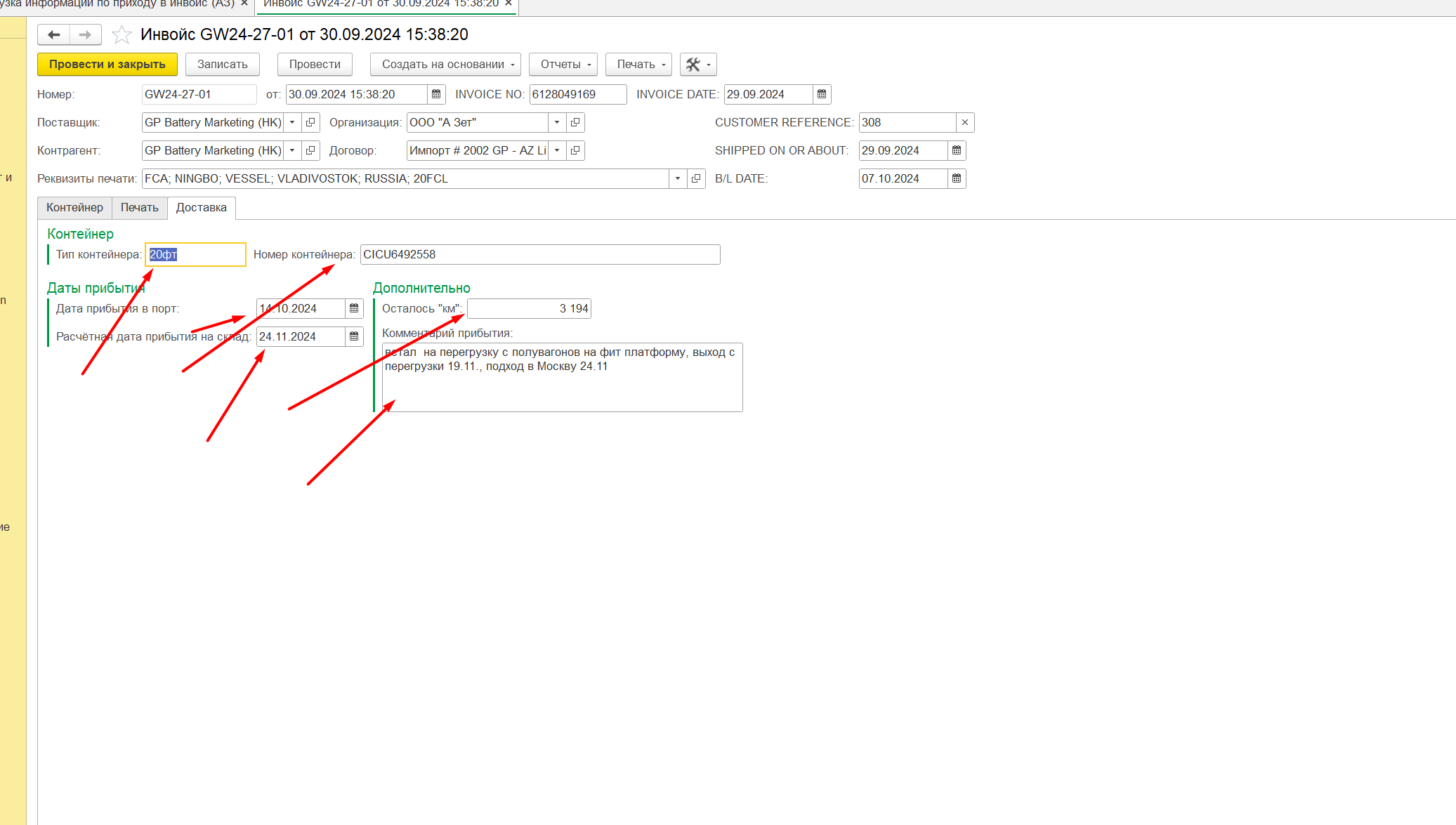 Нажимаем кнопку «Записать изменения» В инвойсе, на вкладке «Доставка» отобразятся эти данные, если не записаны ранее Рисунок 6