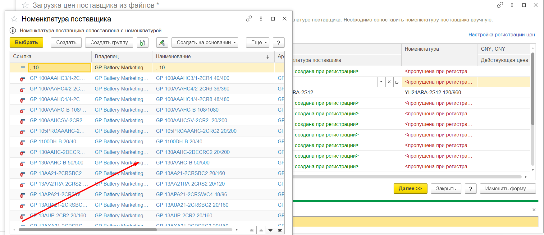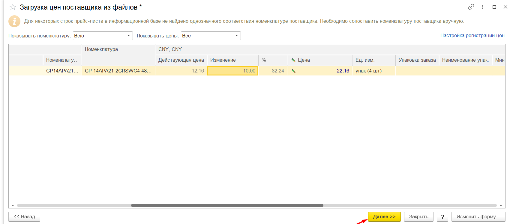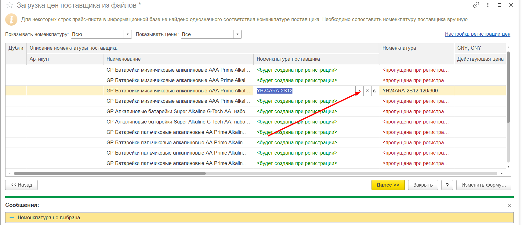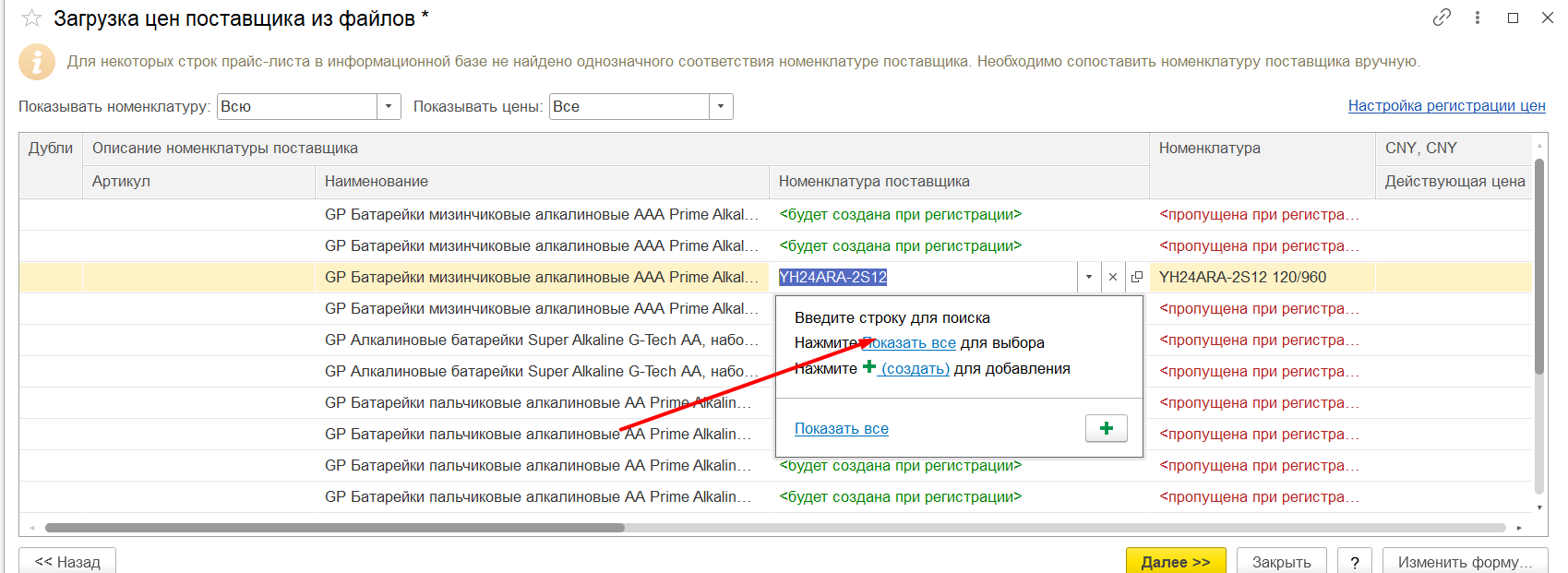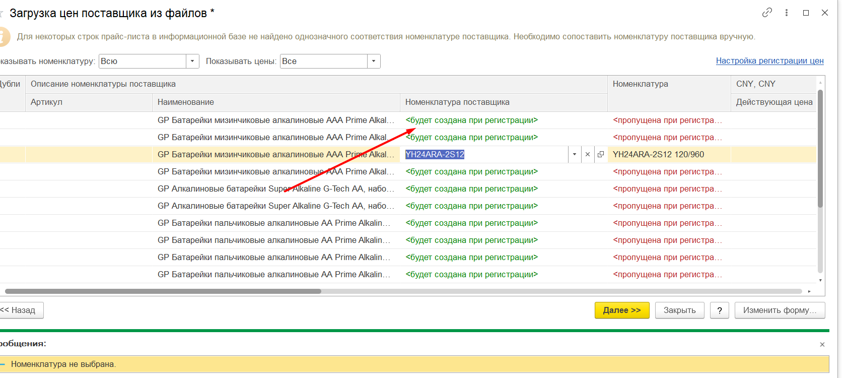 В карточке контрагента найти «Прайс листы» Рисунок 1 Загрузить из внешнего файла, скпировать номенклатуру поставщика из файла ексель и вставить колонку «Номенклатура поставщика» Рисунок 2 Если номенклатура не найдена, будет надпись: «Будет создана при регистрации» Рисунок 3 Тогда нужно будет нажать на стрелку вниз: Рисунок 4 Нажать: «выбрать все» Рисунок 5 Выбрать из списка нужную номенклатуру: Рисунок 6 Такие же действия, при необходимости, нужно повторить в колонке «Номенклатура». Проставить нужные цены, это: Либо изменение в сумме: Рисунок 7 Либо изменение в процентах: Рисунок 8 При необходимости заполнить остальные поля. Нажать кнопку «Далее» Рисунок 9 Вносим нужный комментарий/не вносим никакого: Рисунок 10 Нажимаем кнопку «Готово» и у нас образуется готовый документ «Регистрация цен поставщика», который, при необходимости, мы тоже можем редактировать. Рисунок 11