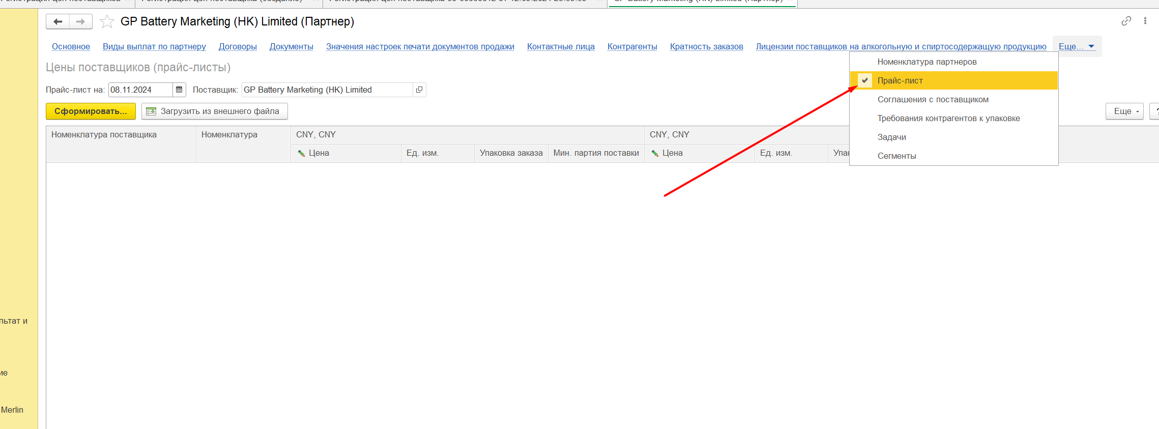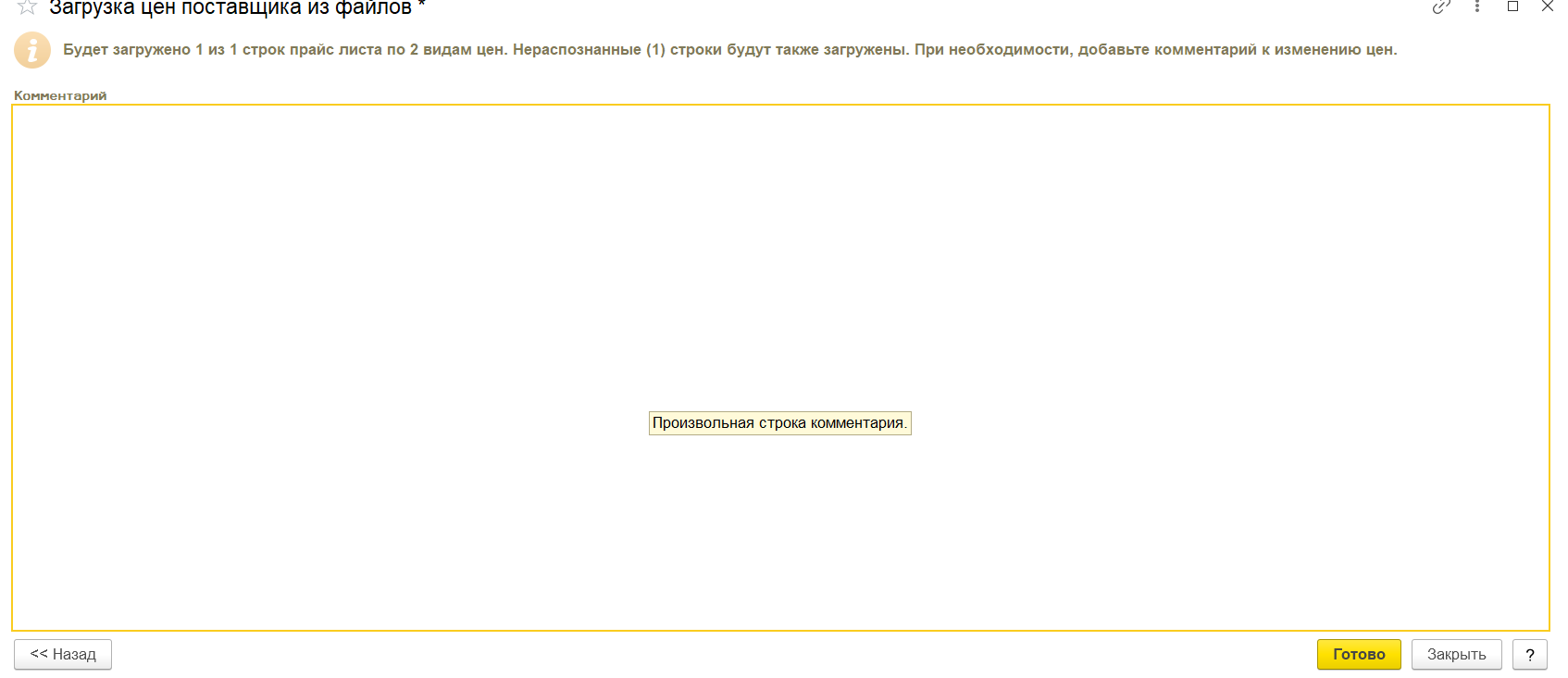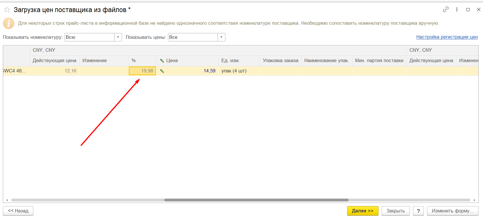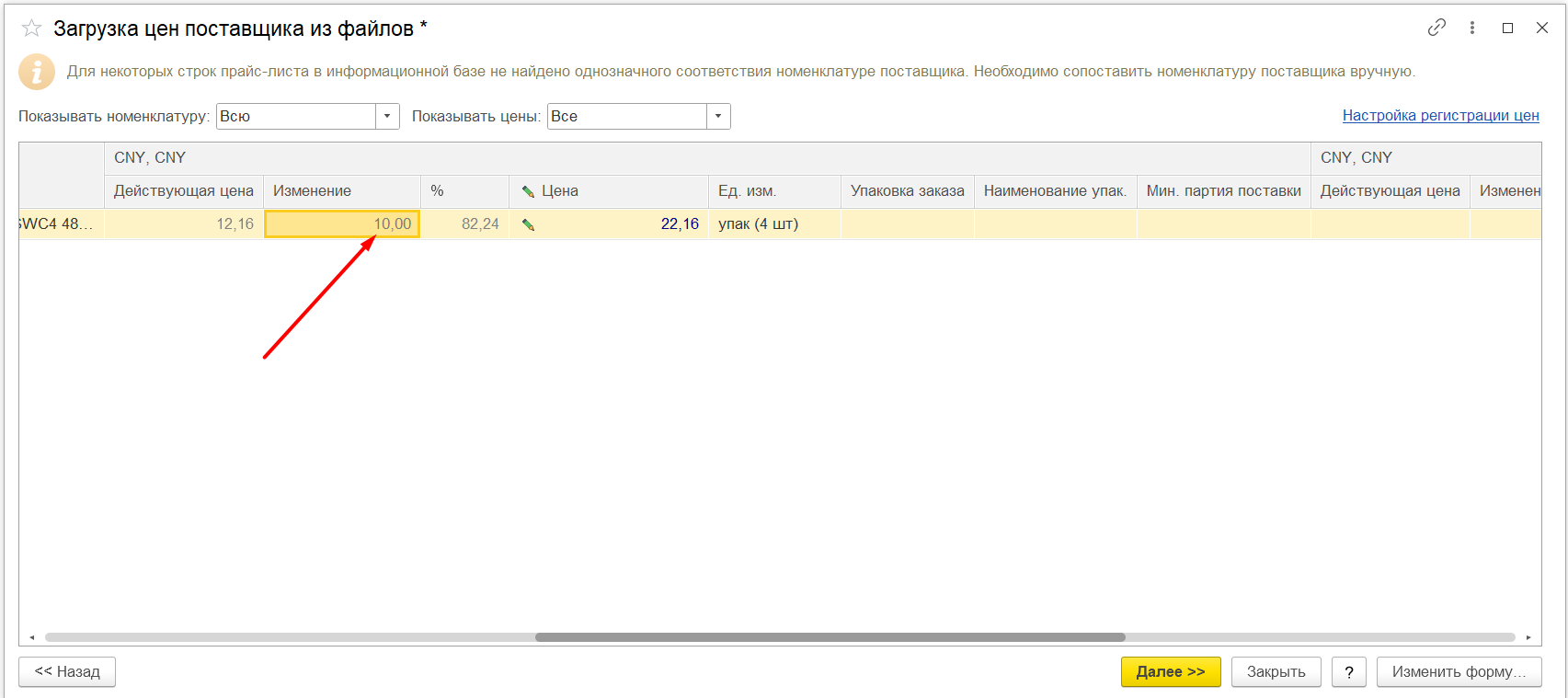 В карточке контрагента найти «Прайс листы» Рисунок 1 Загрузить из внешнего файла, скпировать номенклатуру поставщика из файла ексель и вставить колонку «Номенклатура поставщика» Рисунок 2 Если номенклатура не найдена, будет надпись: «Будет создана при регистрации» Рисунок 3 Тогда нужно будет нажать на стрелку вниз: Рисунок 4 Нажать: «выбрать все» Рисунок 5 Выбрать из списка нужную номенклатуру: Рисунок 6 Такие же действия, при необходимости, нужно повторить в колонке «Номенклатура». Проставить нужные цены, это: Либо изменение в сумме: Рисунок 7 Либо изменение в процентах: Рисунок 8 При необходимости заполнить остальные поля. Нажать кнопку «Далее» Рисунок 9 Вносим нужный комментарий/не вносим никакого: Рисунок 10 Нажимаем кнопку «Готово» и у нас образуется готовый документ «Регистрация цен поставщика», который, при необходимости, мы тоже можем редактировать. Рисунок 11