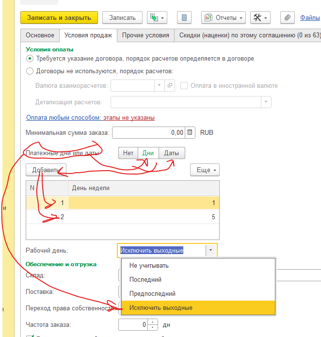 Настройка платежного дня находится в соглашении с клиентом на закладке «Условия продаж». Выбирается режим «День» или «Даты или «Нет». В таблицу добавляются дни или даты, в зависимости от выбранного режима. В поле «Рабочий день» устанавливается необходимый параметр.
