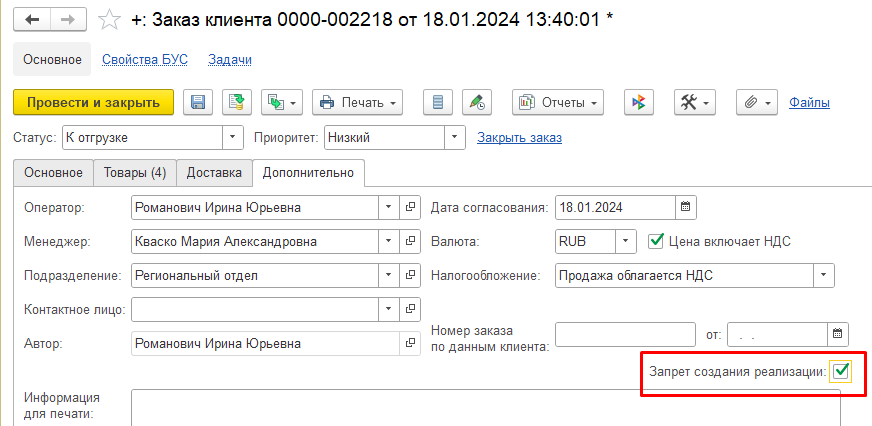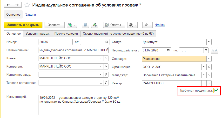 При создании заказа с соглашением, требующим предоплату в заказе автоматически устанавливается запрет. Снятие запрета происходит в самом заказе, доступ имеют пользователи с правами на снятие этого запрета.