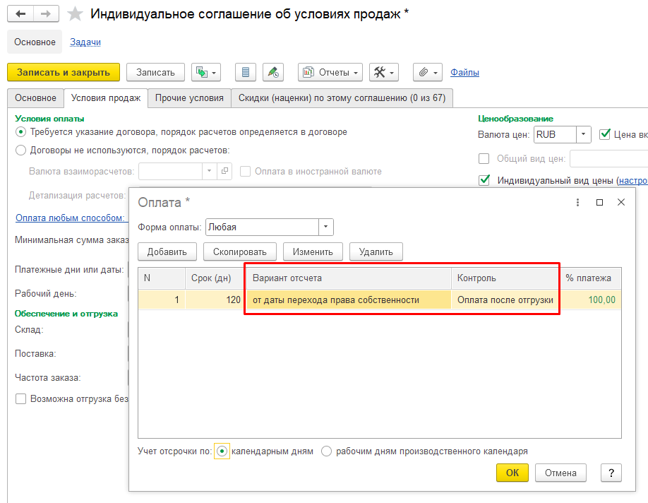 Если предоплата не требуется, то флаг проставлять не надо, но на форме Оплата все равно выбираем от даты перехода права собственности и оплата после отгрузки, единственное отличие в том, что в колонке Срок (дн) нужно проставить 0.