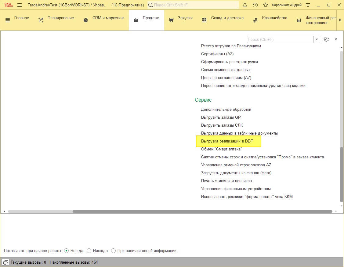 Выгрузка находится в подсистеме Продажи – Сервис – Выгрузка реализаций в DBF