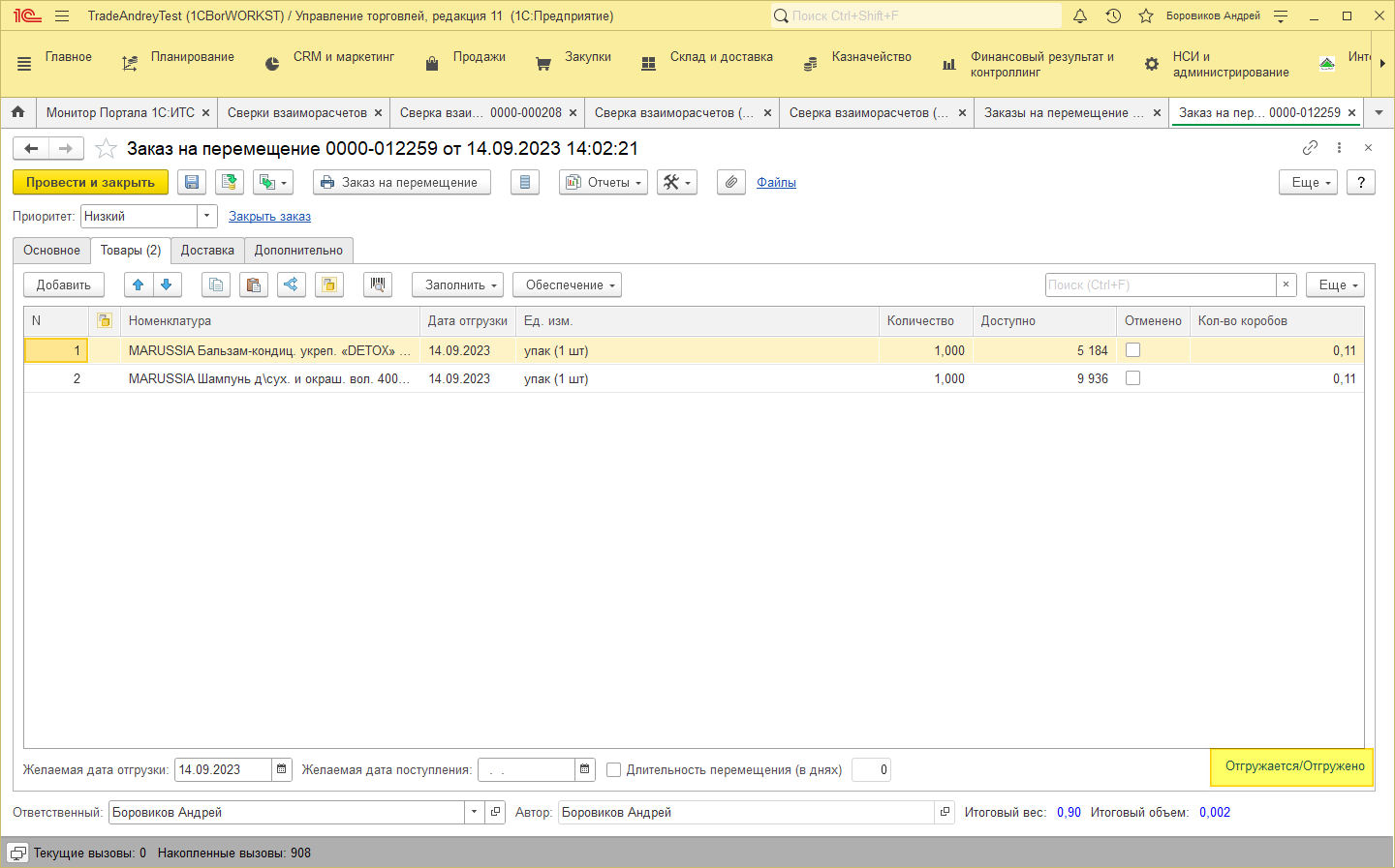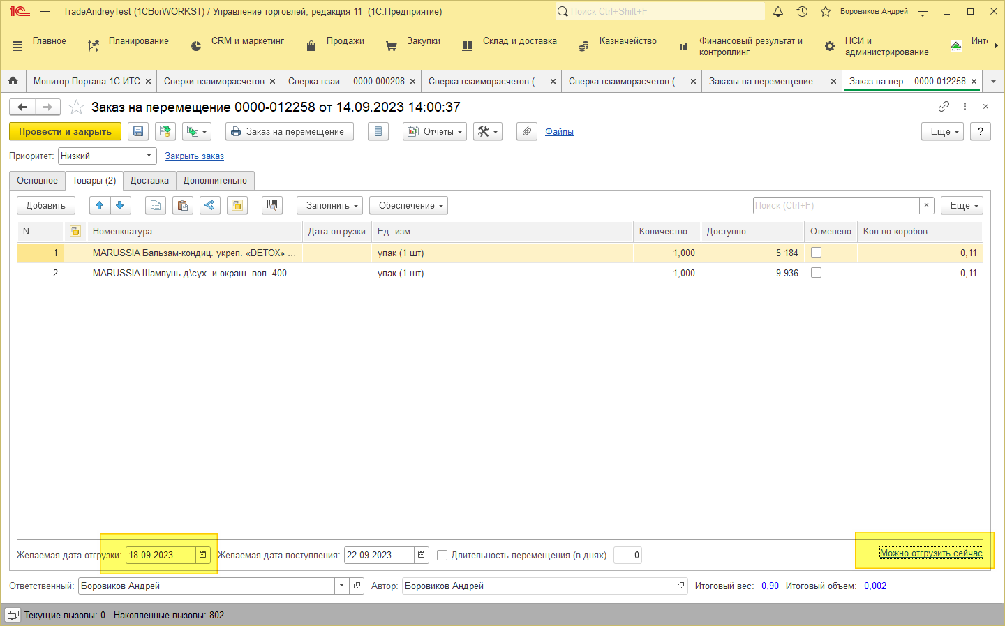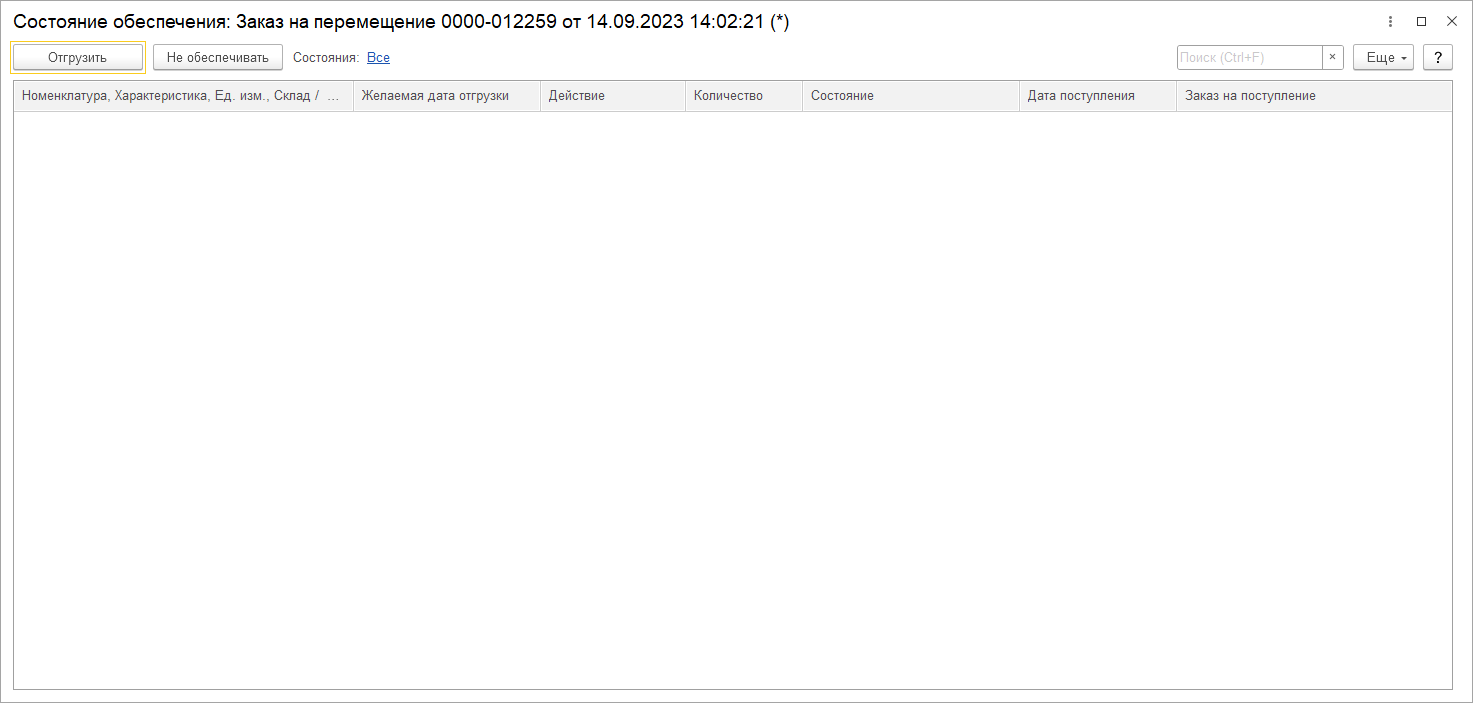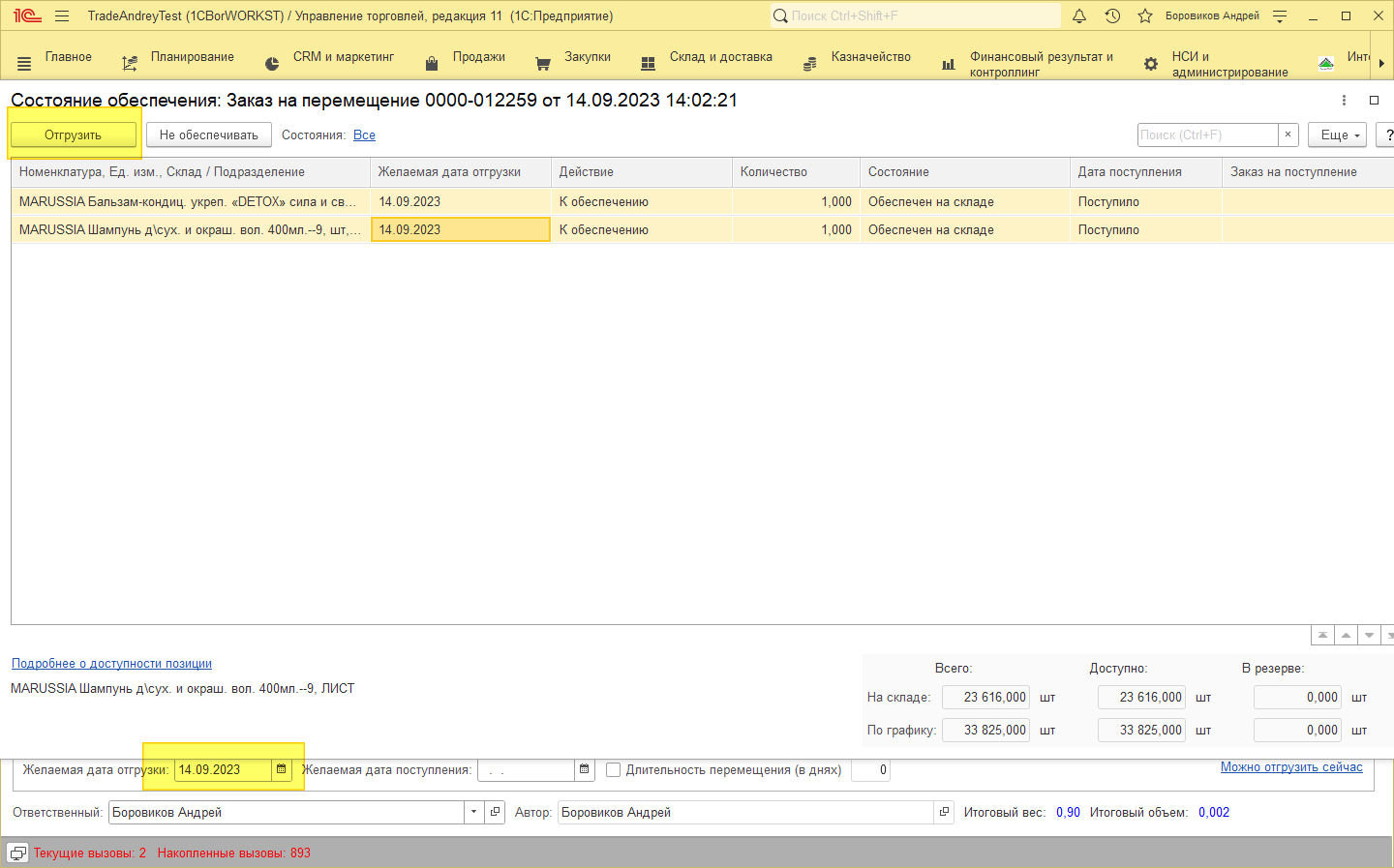 Сам документ от 14.09, отгрузка планируется 18.09, в этом случае обеспечение (правый нижний угол) установлено «Можно отгружать». Т.е. по документу планируется сделать перемещение 18.09.
