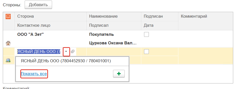 В реквизите «Сторона 2» необходимо указать контрагента. Для этого добавляем новую строку и нажимаем в поле и открываем список всех контрагентов по кнопке «Показать все», либо можно начать вводить название контрагента в поле, и система предложит список существующих конт рагентов.