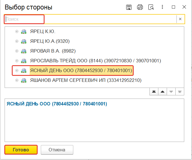 Для того чтобы выбрать необходимого контрагента находим его в списке по поиску или вручную, выбираем и нажимаем кнопку «Готово» или на выбранную строку нажимаем двойным щелчком левой кнопкой мыши.