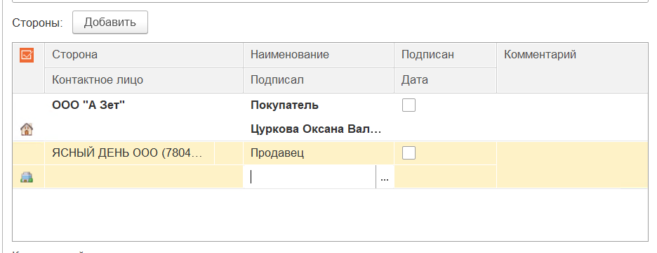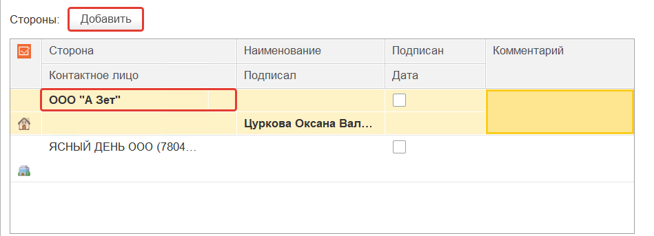 В табличной части «Стороны» через кнопку «Добавить» необходимо указать две стороны поле «Сторона 1» указываем нашу организацию.