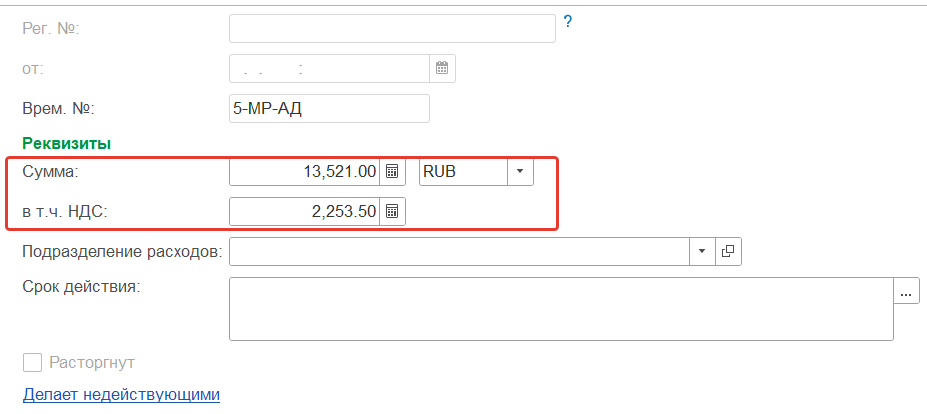 В поле «Сумма» и «в т.ч. НДС» необходимо указать соответствующие данные.
