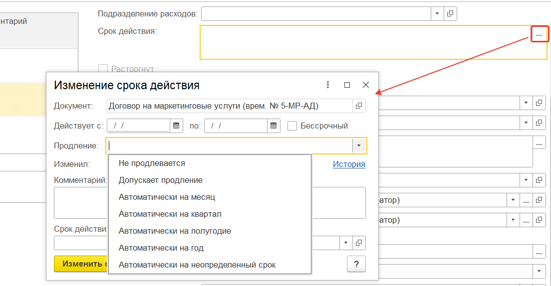 В поле «Срок действия» можно указать период действия договора, является ли он «Бессрочным», а также имеет ли продление.