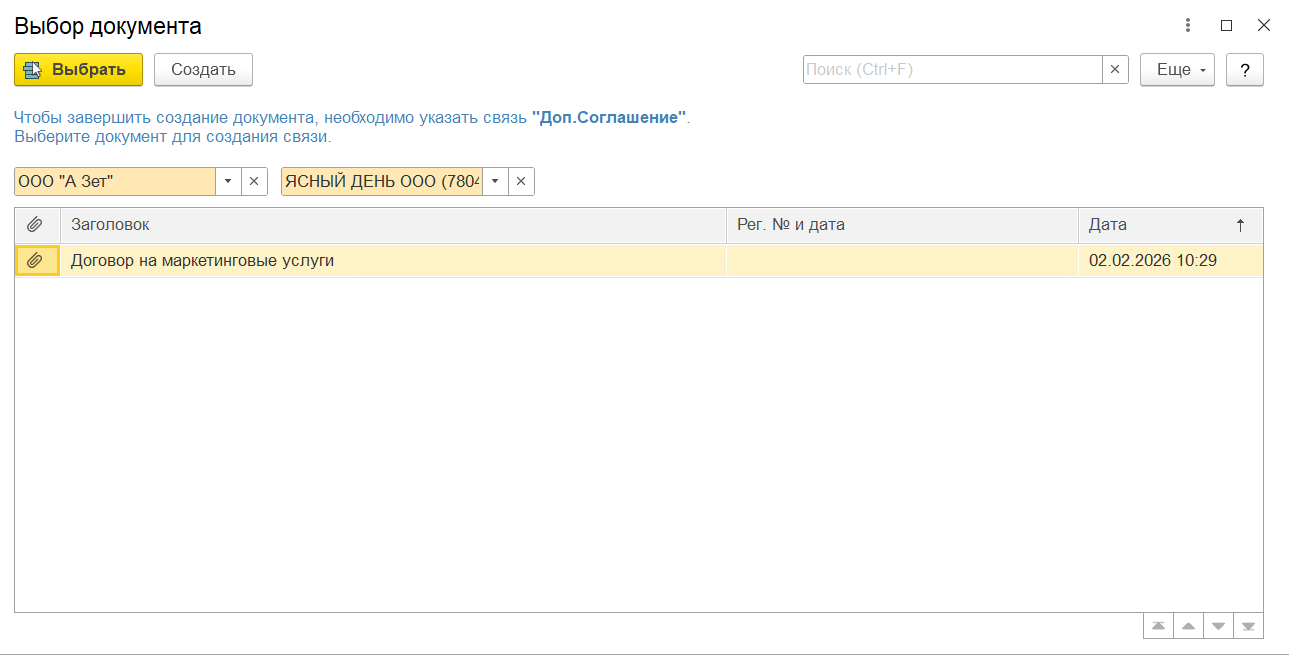 После выбора стороны («Контрагента») при сохранении документа программа автоматически проверит наличие ранее заключенного основного договора данного контрагента. Если таковой имеется, вам будет предложено выбрать этот договор для связи с дополнительным соглашением.