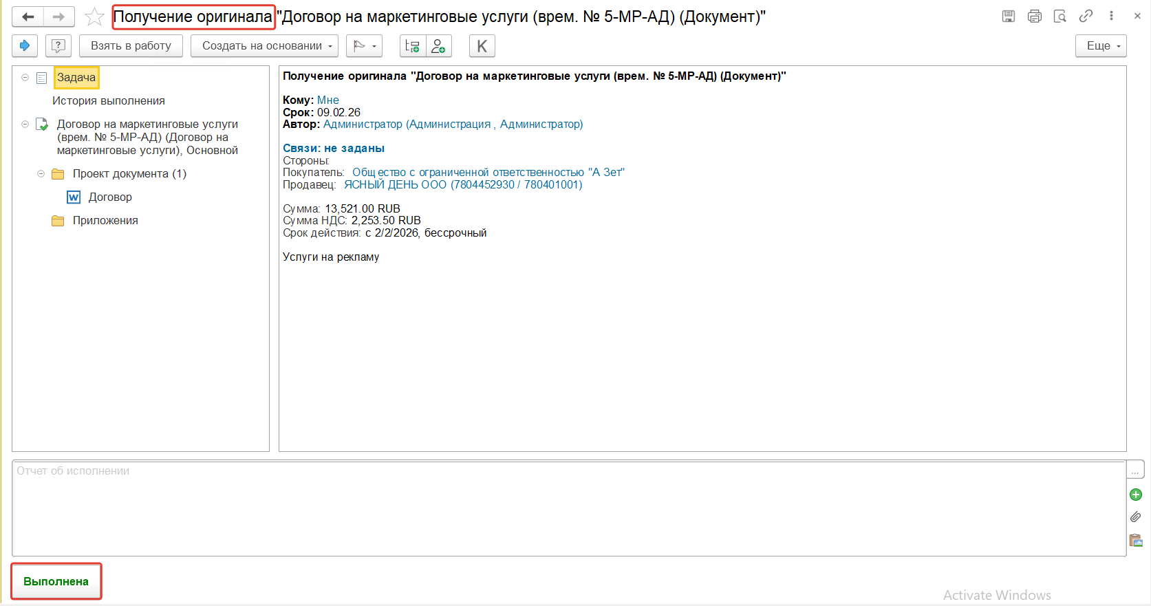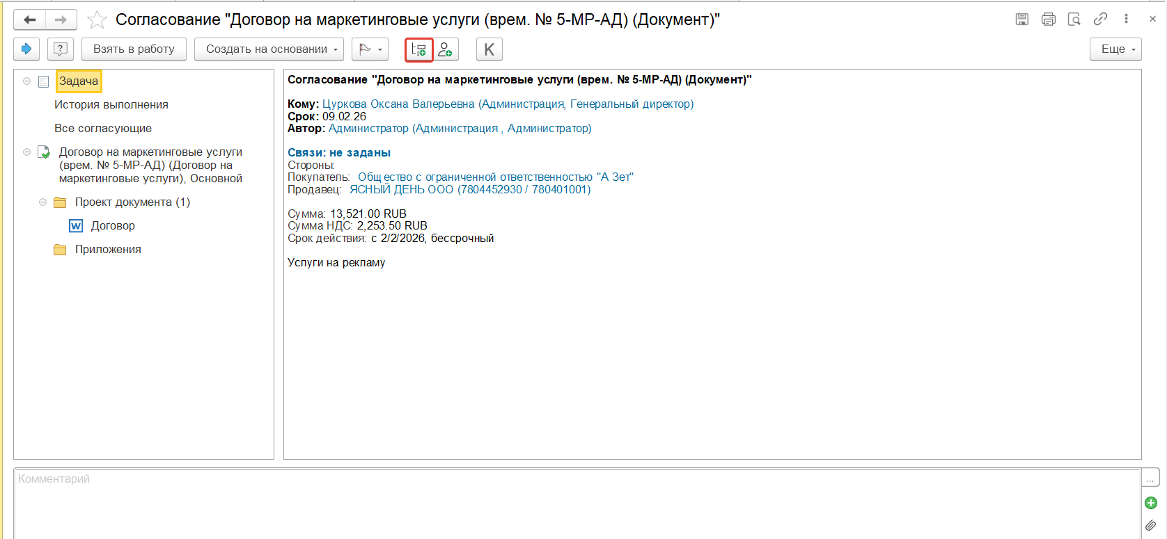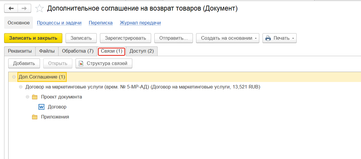После выбора договора на вкладке «Связи» появится связь между договором и дополнительным соглашением.