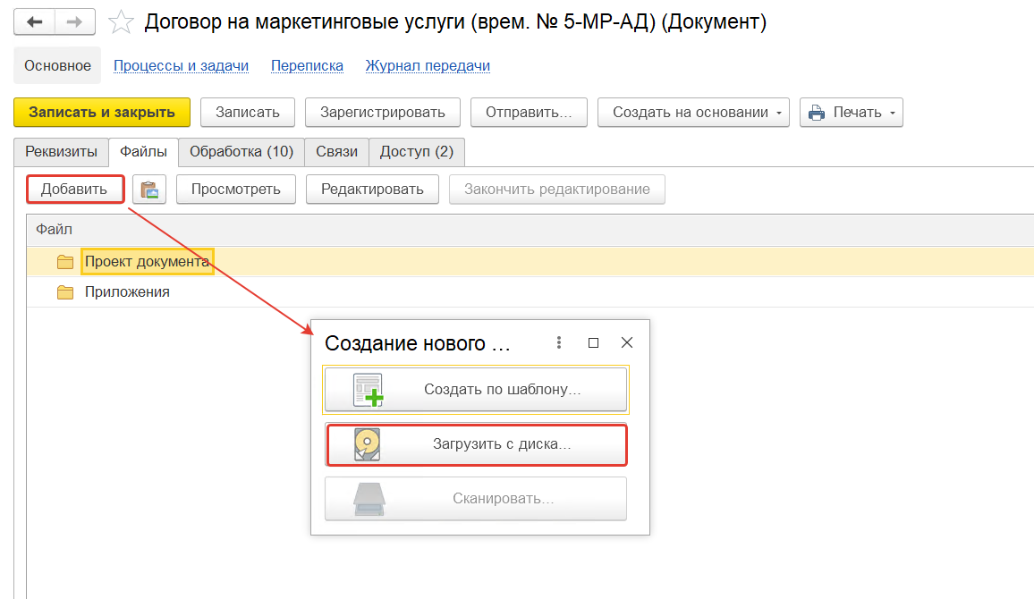 На вкладке «Файлы» (или вкладка «Обзор) добавляются различные типы файлов, которые необходимо прикрепить к этому документу. По кнопке «Добавить» (или кнопке ) открывается окно, в котором можно выбрать создание файла по шаблону или загрузку файла из диска на компьютере.