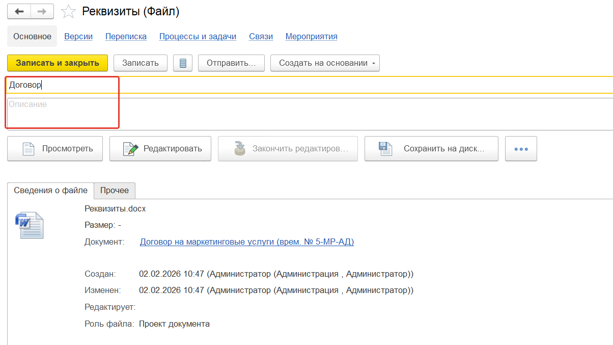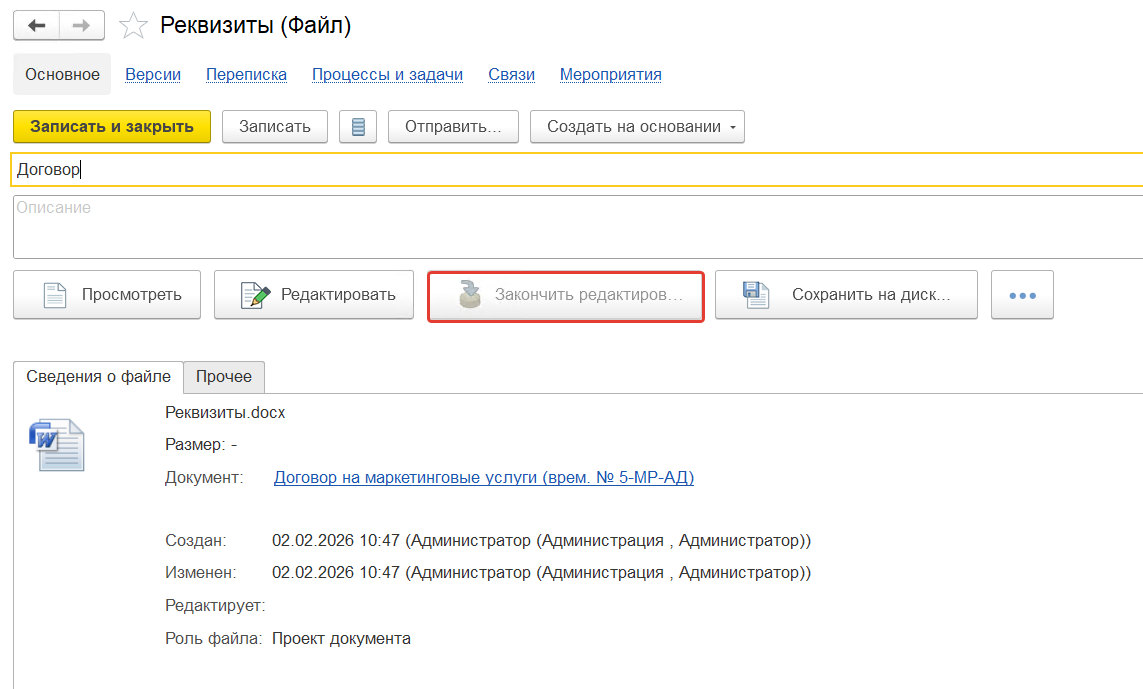 После нажатия кнопки «Редактировать», откроется документ, в который можно внести все необходимые правки. Перед завершением редактирования обязательно сохранить файл и закрыть его (например, для файлов .doc/.docx нажать «Сохранить » в файле и закрыть его). После завершения редактирования файла в системе необходимо нажать на кнопку «Завершить редактирование».