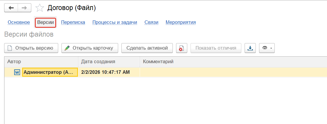 Посмотреть все версии файла в карточке файла перейдя на раздел «Версии», где отображается перечень всех версий, автор, дата версии и изменения.