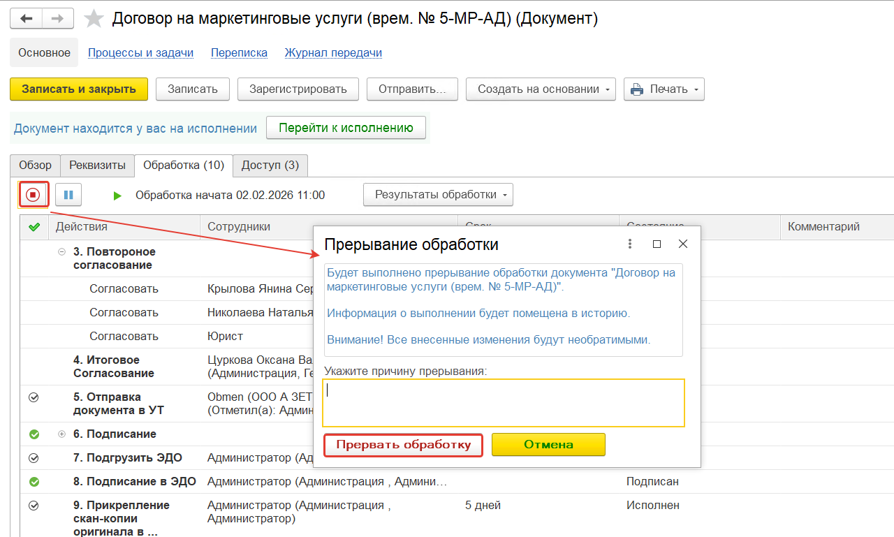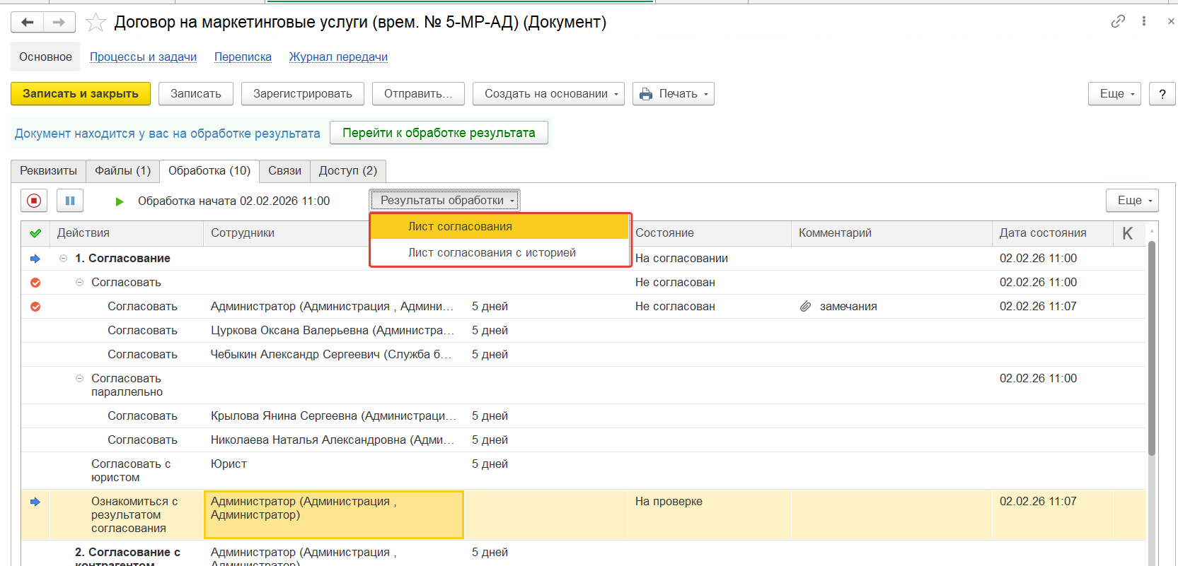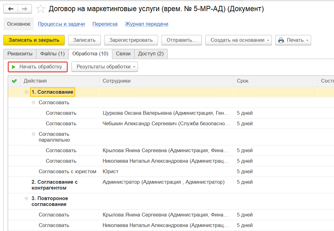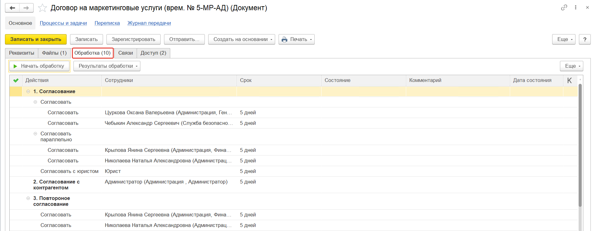 Для старта типового маршрута необходимо перейти на вкладку «Обработка». Здесь отображается настроенный типовой маршрут обработки данного документа: порядок этапов, участники и плановые сроки.