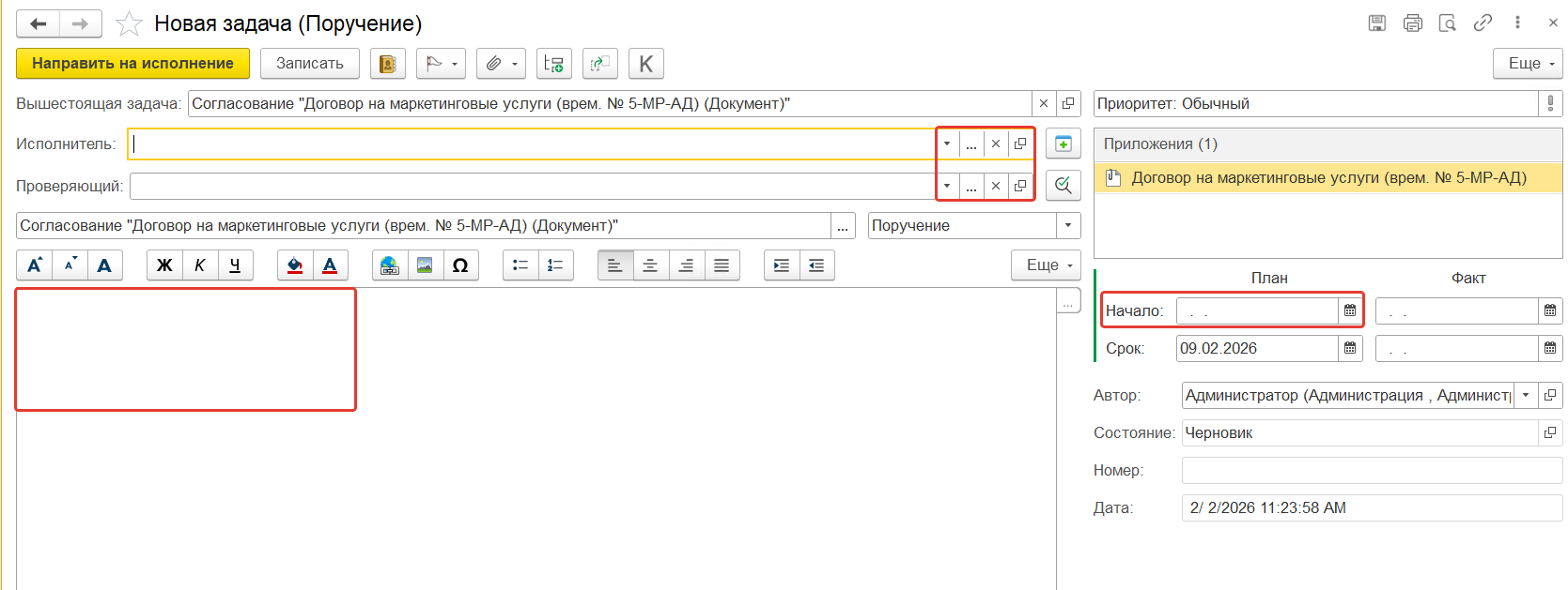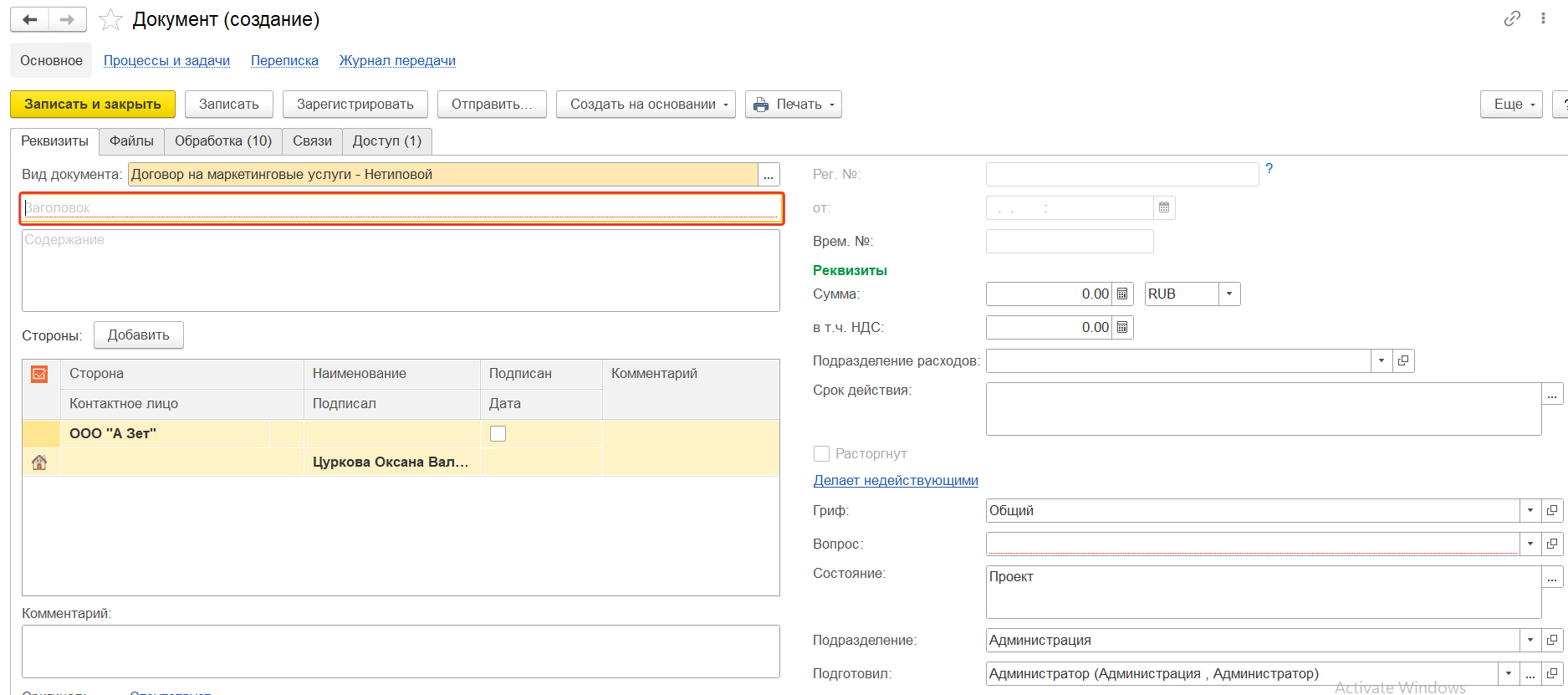 В поле «Заголовок» вводится преамбула договора. В поле «Содержание» более подробная информация о с одержании договора.