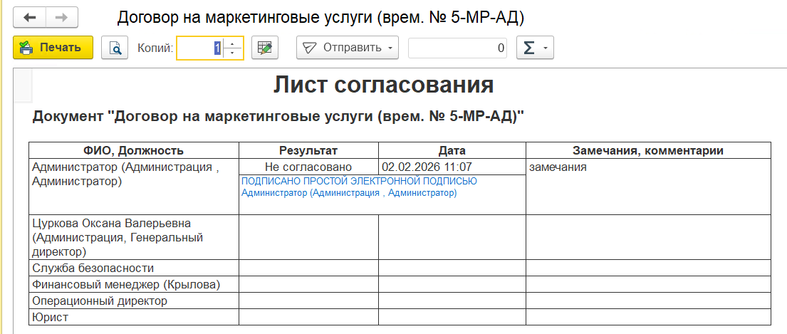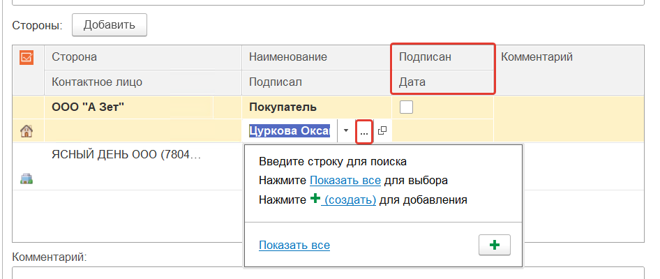 В поле «Подписал» необходимо указать подписанта, для этого с помощью функции перейдем в список сотрудников и выберем необходимого. Так же можно установить флажок «Подписан» данный договор, указать «Дату» подписания и оставить «Комментарий».