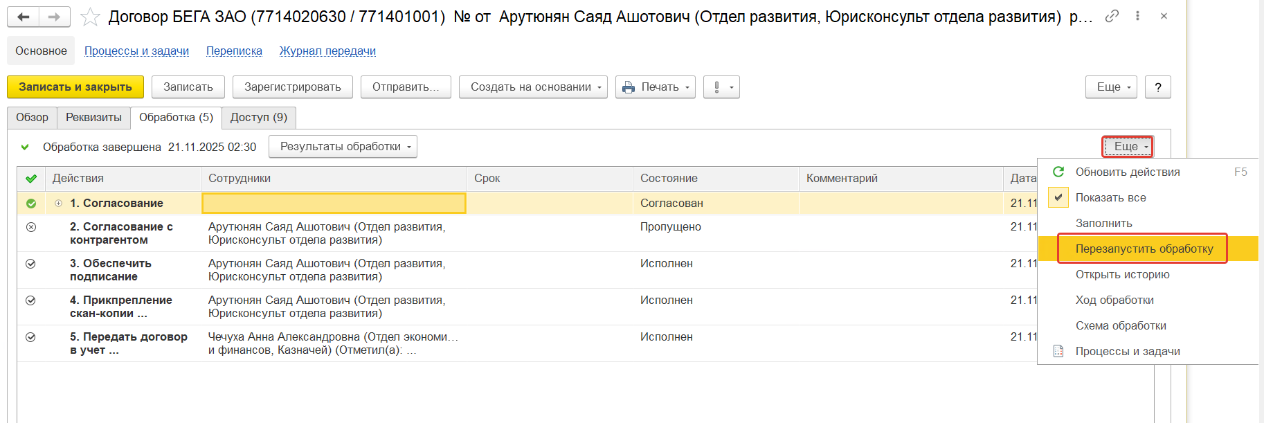 После того как все необходимые участники будут установлены и процесс будет готов к запуску, необходимо нажать кнопку «Начать обработку».