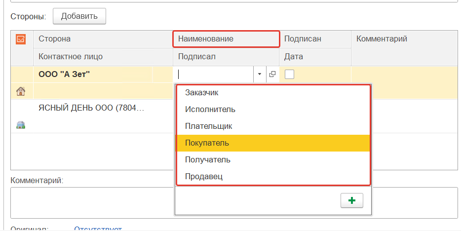 В поле «Наименование» можно выбрать кем является организация в данном договоре. Укажем «Покупатель».